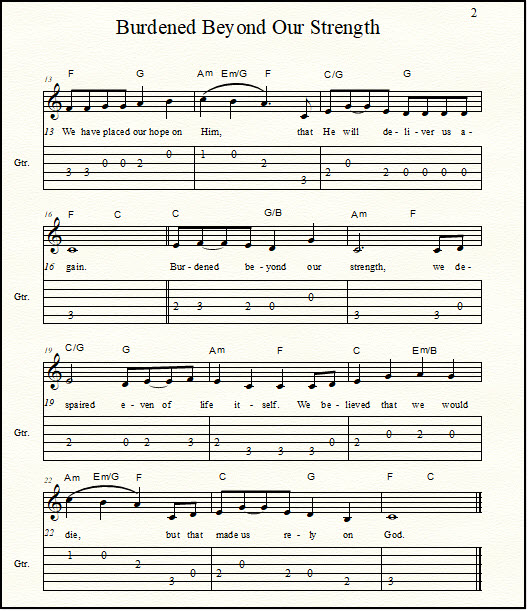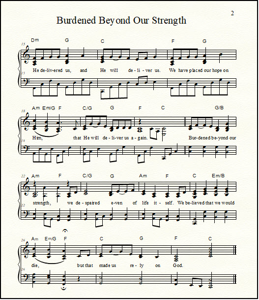 The link for the Bible song "Burdened Beyond Our Strength" for piano: